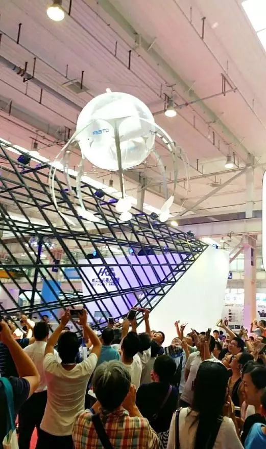 展厅中,一款空中水母机器人格外引人注目。这款机器人由德国FESTO公司所研制生产,因长有触角、在空中漂浮时像水中浮动的水母而得名。机器水母体内充满的氦气是其动力源,它的球形身体是用激光烧结制成的密封舱,8根触须带动机器人前进。销售经理崔鹏告诉瞭望记者,这是全球首款蠕动式的空中飞行器,每次充电可飞行3小时左右,升空高至30米以上,未来主要运用在航空领域。
