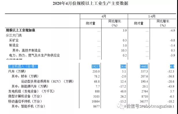 今天,国家统计局发布了2020年4月工业机器人统计数据,数据显示,4月份,全国规模以上工业企业的工业机器人产量19257套,同比增长26.6%;1-4月全国规模以上工业企业的工业机器人产量为54602套,累计增长4%。