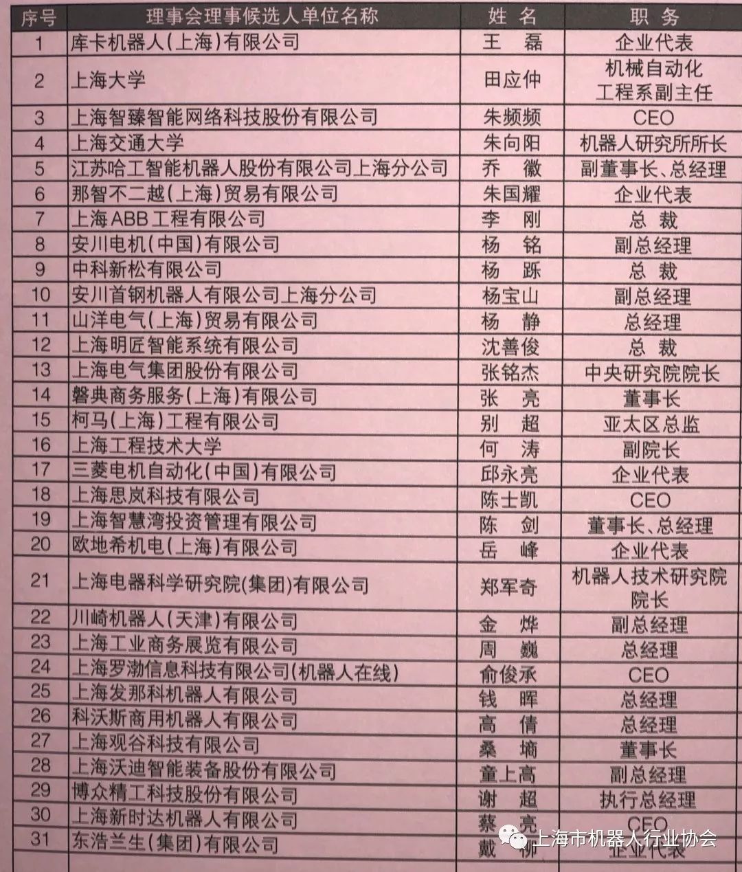 会议选举产生:东浩兰生(集团)有限公司为BETVLCTOR伟德国际网页版会长单位,戴柳任协会会长;上海电气集团股份有限公司为BETVLCTOR伟德国际网页版常务副会长单位,张铭杰任协会常务副会长(法定代表人); 库卡机器人(上海)有限公司为BETVLCTOR伟德国际网页版副会长单位,王磊任协会副会长;上海智臻智能网络科技有限公司为BETVLCTOR伟德国际网页版副会长单位,朱频频任协会副会长;上海ABB工程有限公司为BETVLCTOR伟德国际网页版副会长单位,李刚任协会副会长;中科新松有限公司为BETVLCTOR伟德国际网页版副会长单位,杨跞任协会副会长;上海发那科机器人有限公司为BETVLCTOR伟德国际网页版副会长单位,钱晖任协会副会长;上海新时达电气股份有限公司为BETVLCTOR伟德国际网页版副会长单位,蔡亮任协会副会长。