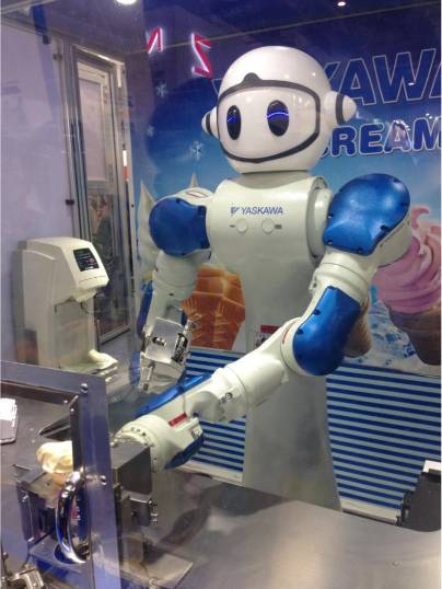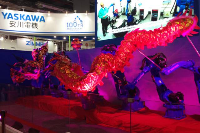 安川电机:一台控制器控制8台机器人协同的“机器人大舞龙系统”展台被观众重重包围住。该舞龙系统是业内首个实现1台控制柜同时对8台机器人协同进行控制的前沿技术。8台机器人之间相互监控彼此的动作进行最佳协同作业,实现和专业舞龙队同等的高难度逼真精湛动作。控制器实现对机器人动作的加速和减速的自由控制,使机器人能够挑战游龙、穿腾、翻滚等多种舞龙组合造型。安川的冰淇淋机器人和咖啡机器人展区有许多观众排队进行购买。机器人动作起落连贯有序,虽然就是普通的冰淇淋,但是观众纷纷表示想尝尝机器人制作冰淇淋的鲜头。