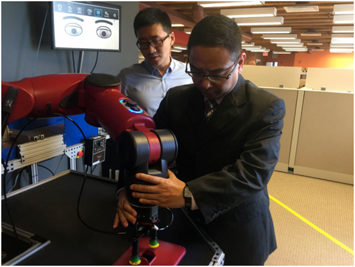唐贵发在体验Baxter机器人