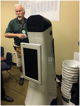 访美期间,唐贵发一行在硅谷一大型建材超市观看了新型孵化的机器人企业产品—fellow robots的Navii。该项目投资人之一也是协会的会员单位,点亮投资管理(上海)有限公司总经理张亮先生向协会一行展示了这个已经应用在美国超市的机器人Navii。该机器人1.5米左右的高度,可以在超市自由穿梭,指引顾客找到想要购买的物品的位置并显示该产品的库存数量,还可以提醒售货员补充货物上架等。该机器人有望在今年中国工博会上展出。