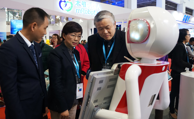 在小i机器人展台,戴会长仔细听取了公司副总裁梅莉关于智能对话机器人(服务机器人中的Bot产品)的介绍。i机器人创立以来专注于Bots技术的研究和开发,在自然语言处理、语义分析和理解、知识工程和智能大数据等人工智能相关技术甚至已走在行业前列。在机器人应用产业化方面,小i机器人经过15年的不断积累,实现了全球最大规模的Bots商业化应用,为中国数百个大型企业和政府机构提供Bots应用,服务用户超过5亿人,形成了独有的Bots经济模式。会长对此表示充分肯定,勉励企业要发挥好已有的优势,推动Bots应用发展,让更多的用户了解和享受Bots带来的价值。