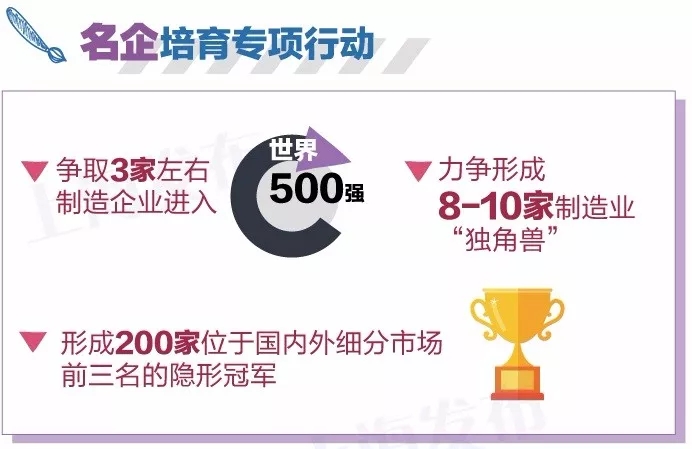 一是做强世界一流企业,使上海制造辐射面更广。构建根植本地、面向全球布局的创新、生产和服务网络,加快新一代智能制造模式应用;以龙头企业为引领,建设20个工业互联网平台,争取3家左右制造企业进入世界500强。