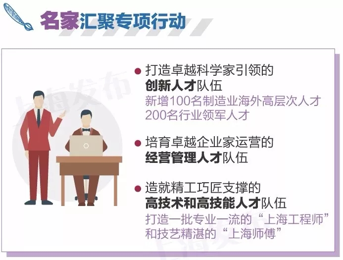 二是实施卓越制造人才计划,培育专业人才。打造一批“上海工程师”、“上海师傅”, 重点支持面向工程化、产业化应用的高精尖人才,加强住房、落户等人才服务。
