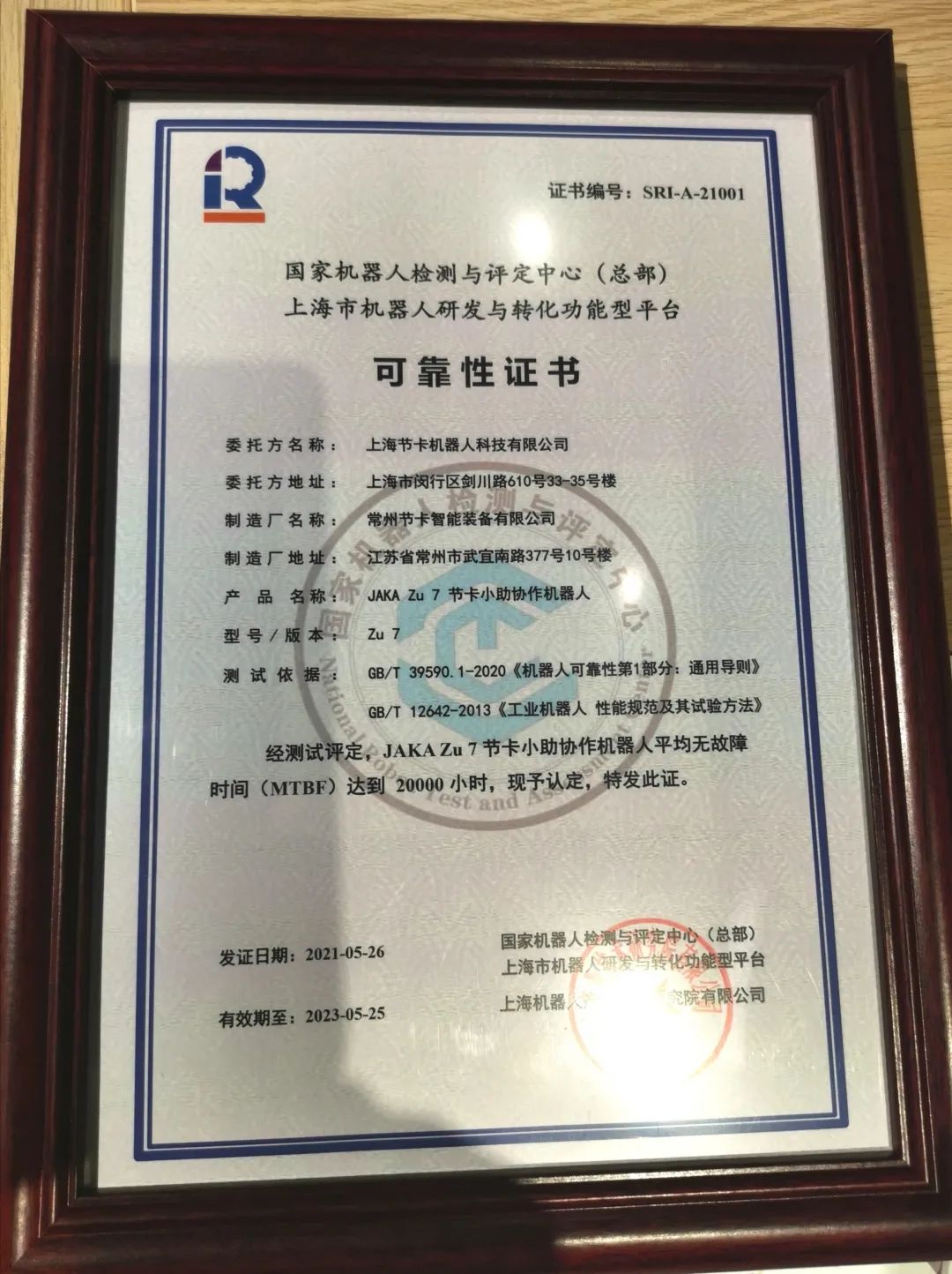 作为协作机器人领先企业,节卡机器人成立七年以来一直致力于研发和生产可靠、稳定的产品,提高国家协作机器人产业的发展水平。在可靠性方面,节卡协作机器人获得了2万小时MTBF(平均 无故障时间)认证,成为业内首家,也是目前唯一一家通过MTBF 2万小时测试的厂商。